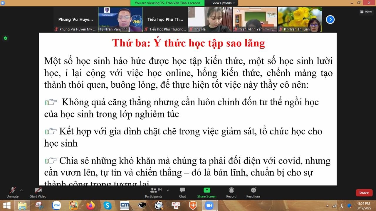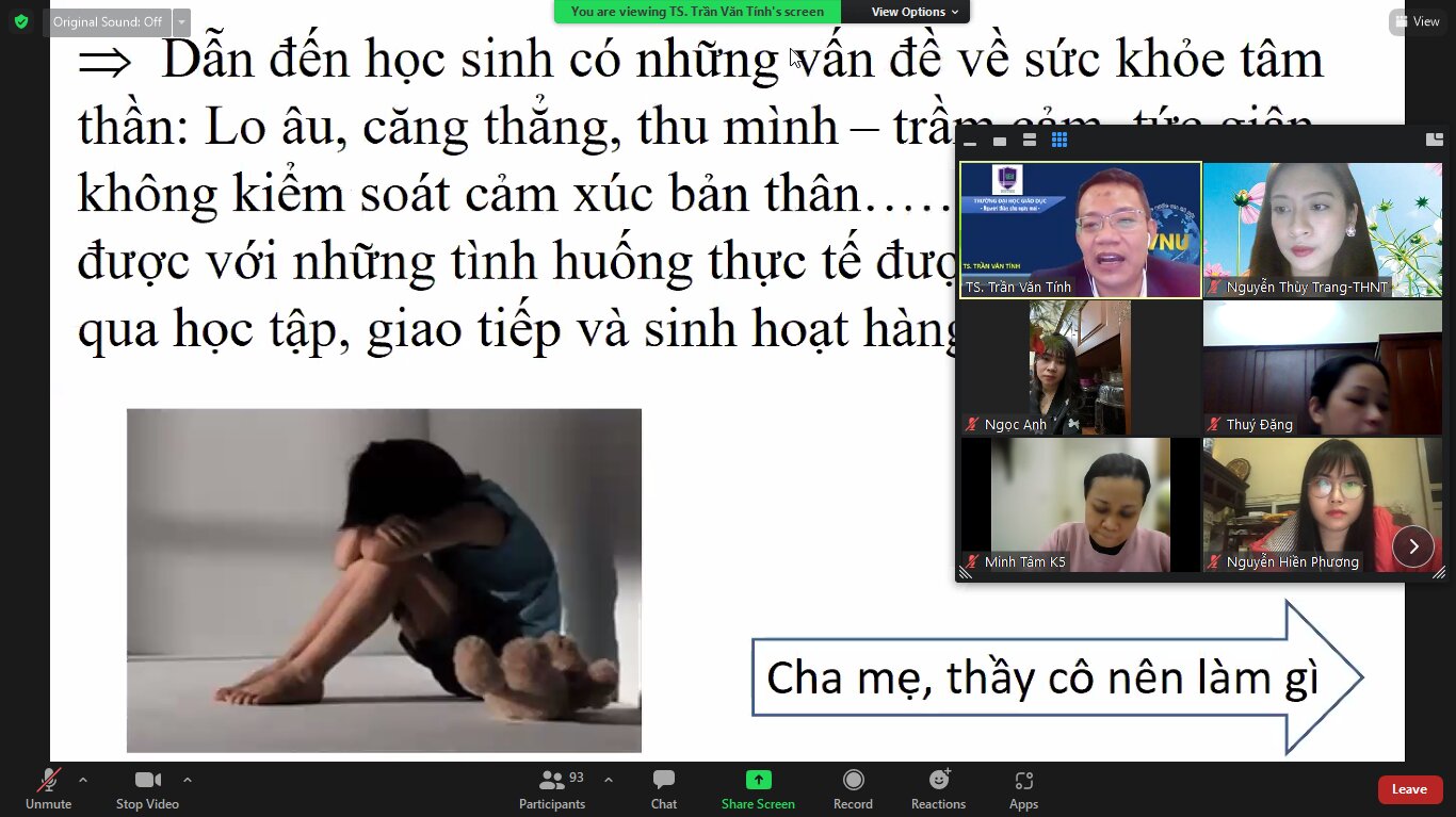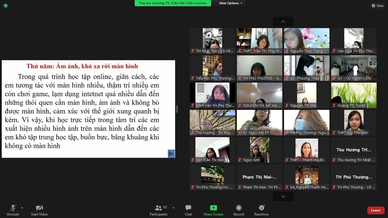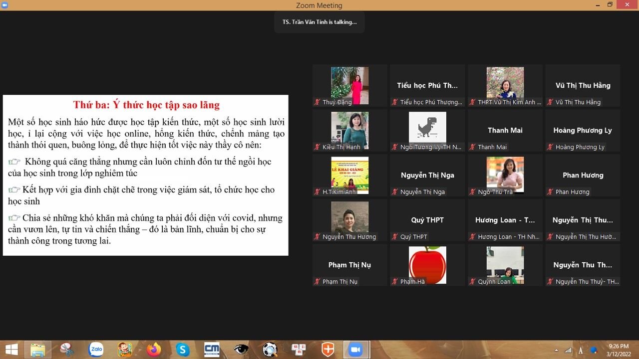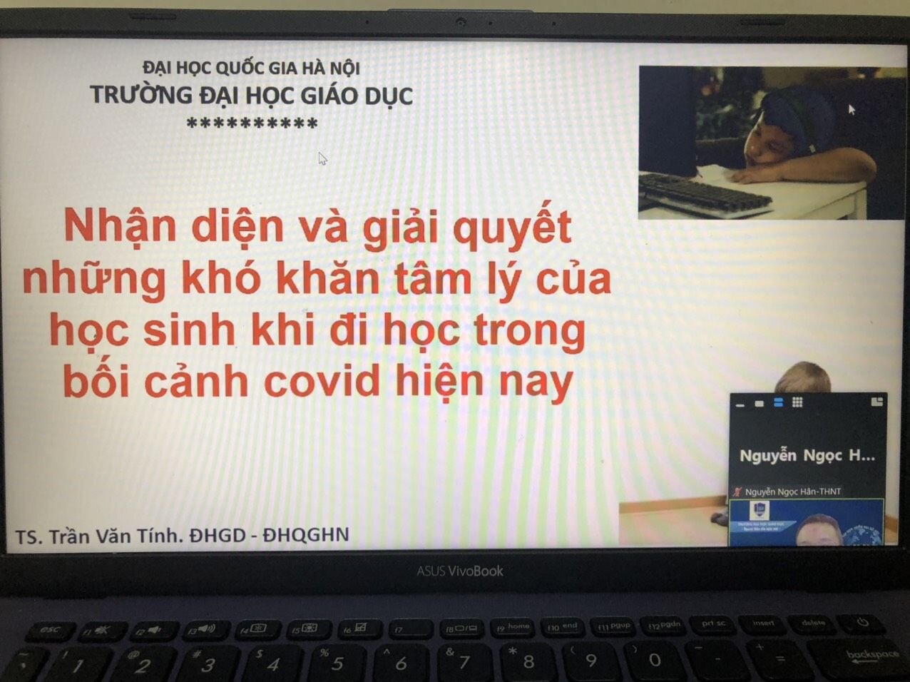 " Nhận diện và giải quyết những khó khăn tâm lý của học sinh khi đi học trong bối cảnh COVID hiện nay" do Tiến sĩ Trần Văn Tính, Trưởng khoa GD và PTCN, ĐHGD - ĐHQG Hà Nội chia sẻ với CB, GV hai nhà trường.