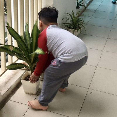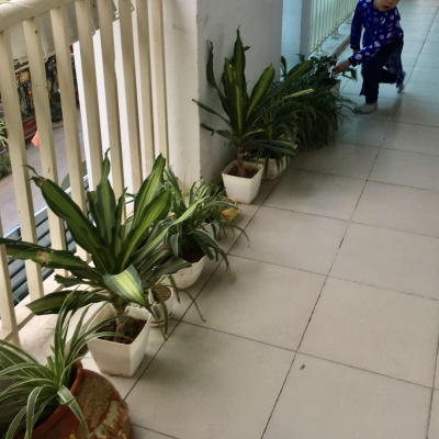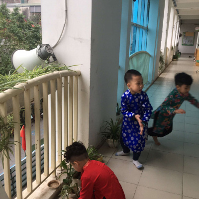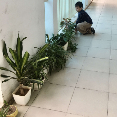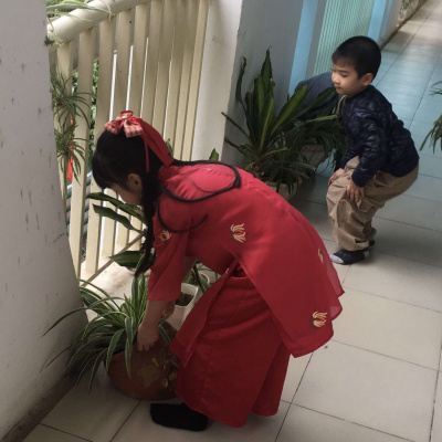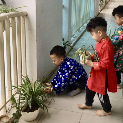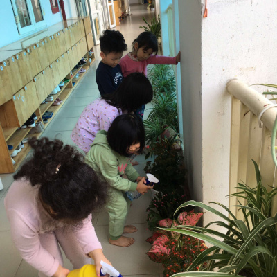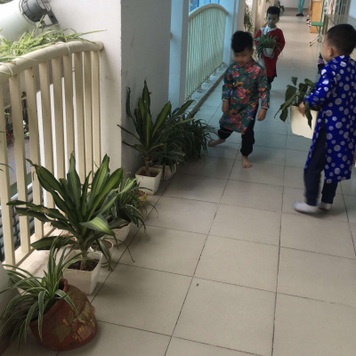 Cùng các bé mẫu giáo lớn A4 giúp cô sắp xếp các chậu hoa cây xanh sau dịp tết.